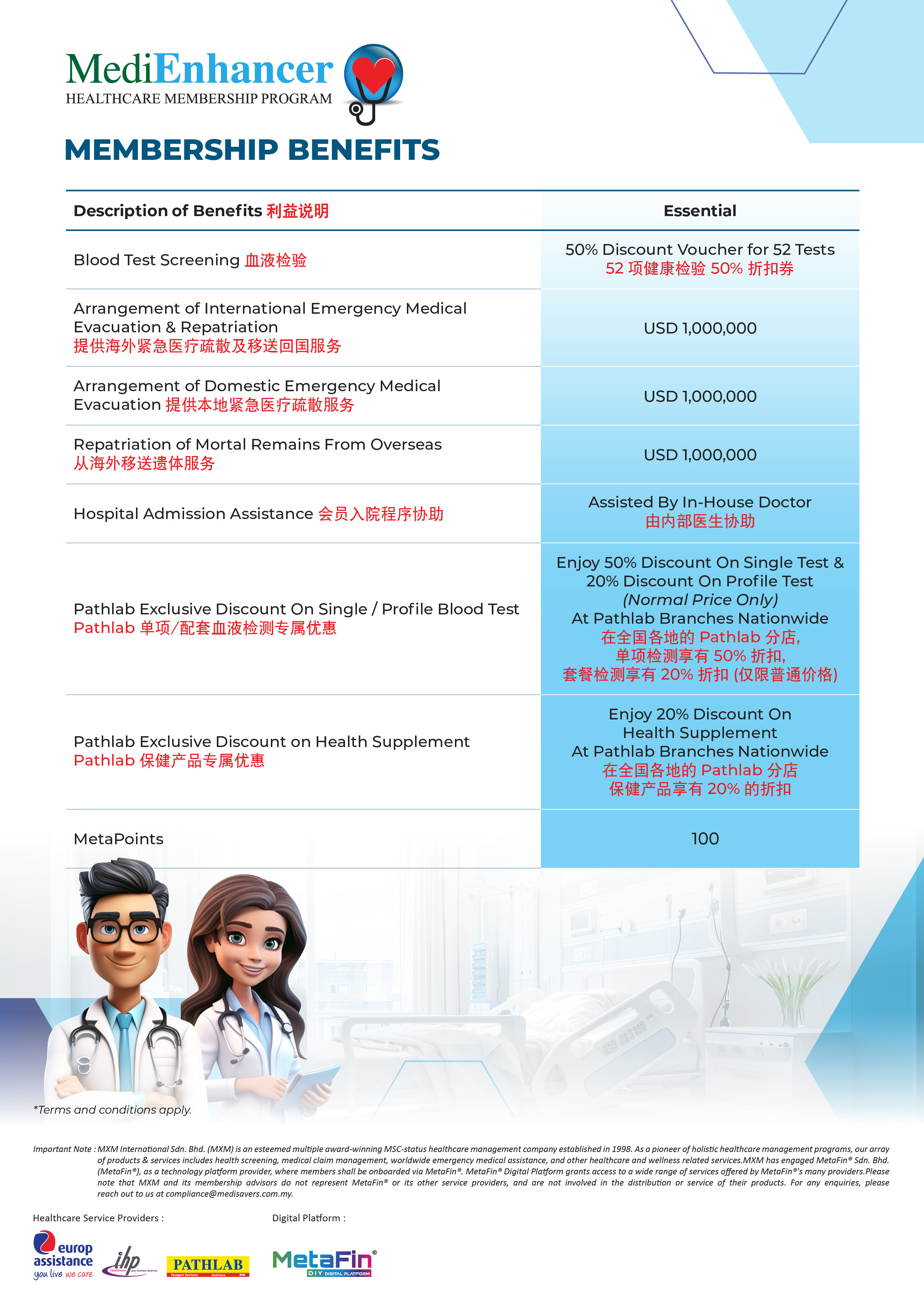 - Medical emergency assistance domestic & international, including repatriation and mortal remains, covered up to USD1,000,000 worth RM1,849